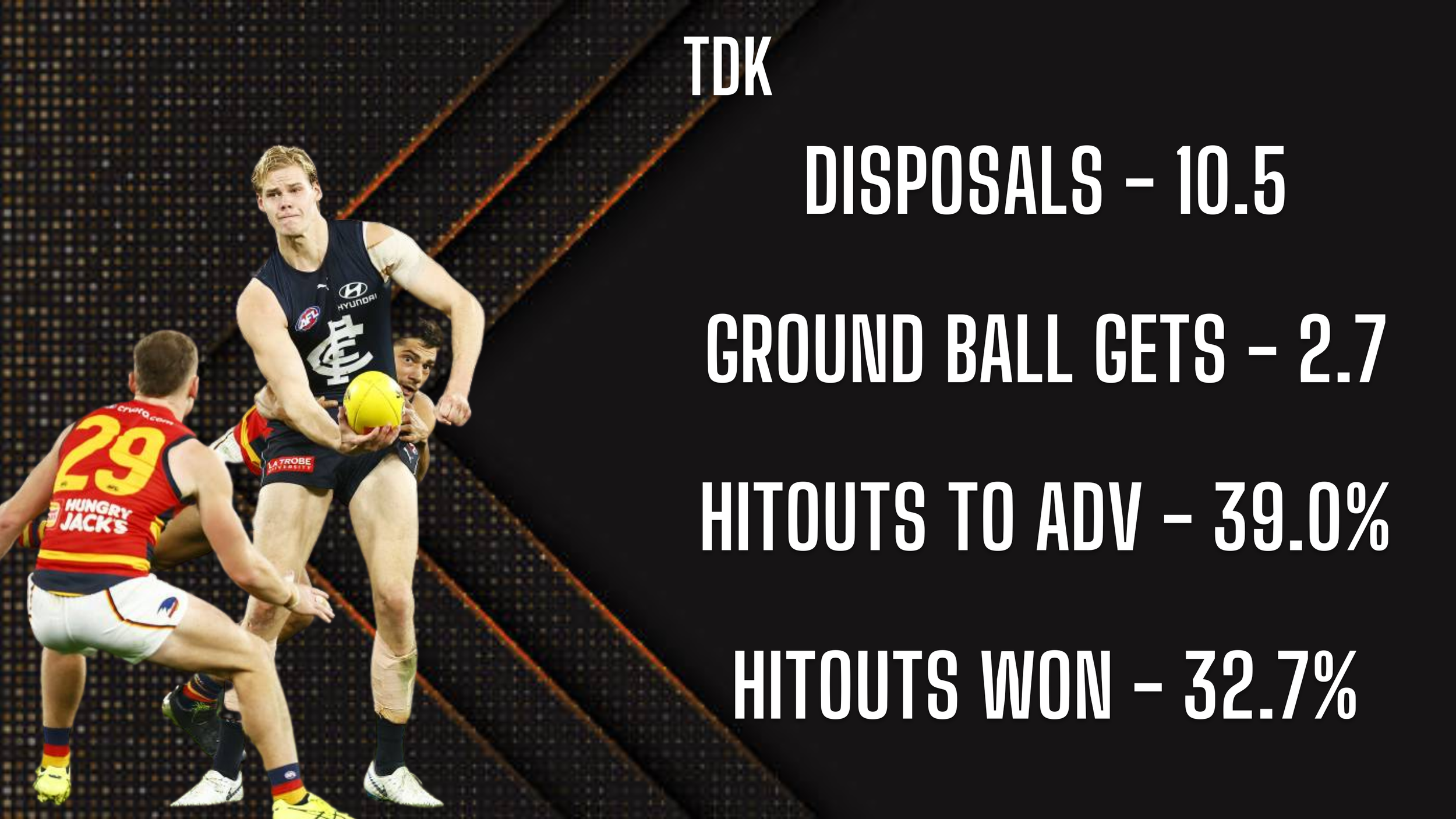 TDK has taken the reigns of No.1 Ruckman and looks set to kick on with the added responsibility. Probably a year too soon, but he has stood up and developed his game in front of the Fan's eyes weekly. Starting to become a KEY component in the defence down the wing, and also exits from d50. Expect him to drag Nank around the ground and use his agility to test him.
